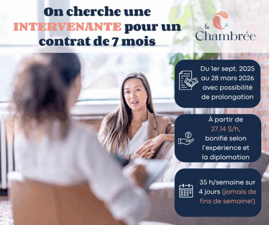 Travailler à La Chambrée, c’est joindre ta voix à un mouvement. C’est poser un geste fort : choisir de croire en un monde où la violence conjugale n’a pas sa place et y contribuer chaque jour.